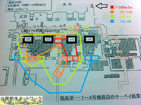 3号機の爆発直後の放射線量はそれほど高くないようだが、この図では風向きによる影響が考慮されていない。風下では放射線量が高かったはずである。